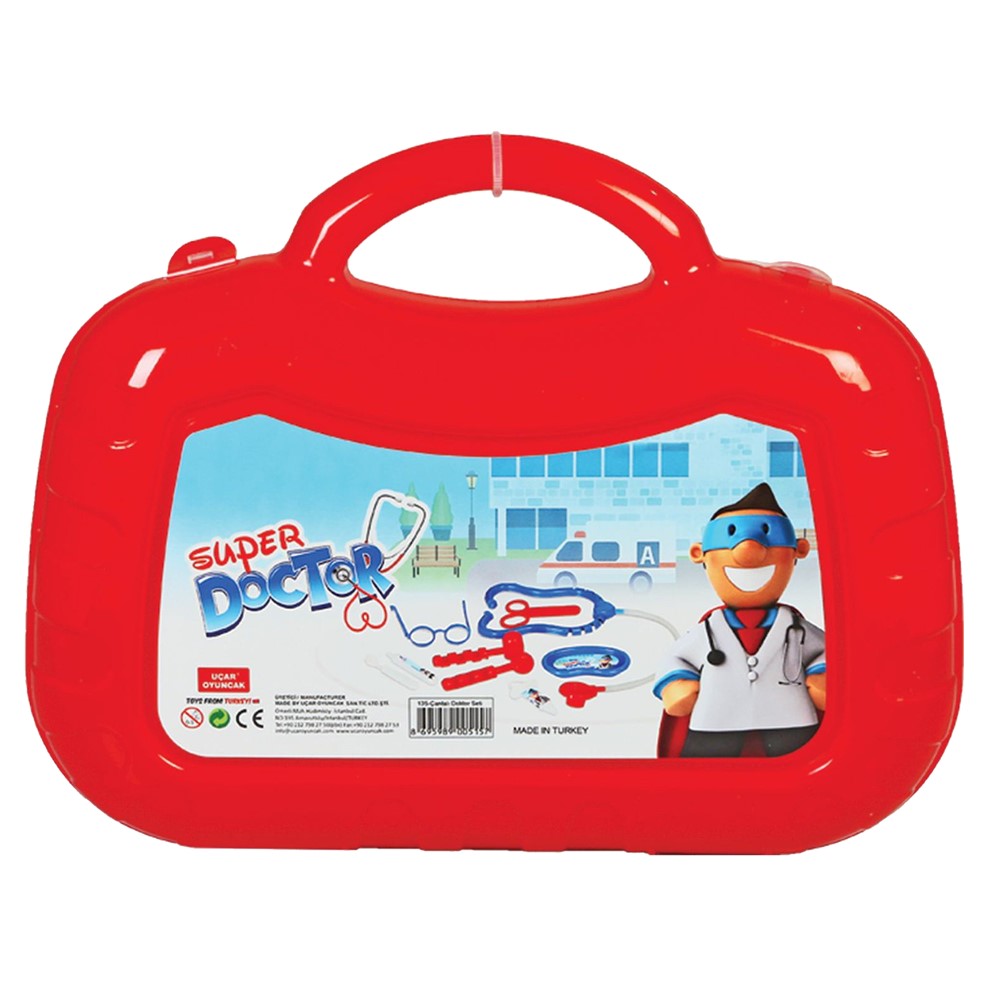 Set me vegla mjekësore lodër për fëmijë, i cili përmban një gërshërë, një palë syze, një shiringë, një stetoskop dhe aksesorë të tjerë, prej materiali plastik, në ngjyrë të kuqe. Kjo lodër ndihmon në zhvillimin e aftësive motorike dhe aftësive të të mësuarit, nëpërmjet lojës në role. Materiali përbërës dhe boja nuk kanë përmbajtje toksike apo të dëmshme për fëmijët dhe produkti është i çertifikuar për siguri në përdorim. Ky produkt është i përshtatshëm për përdorim nga fëmijë mbi 3 vjeç.
