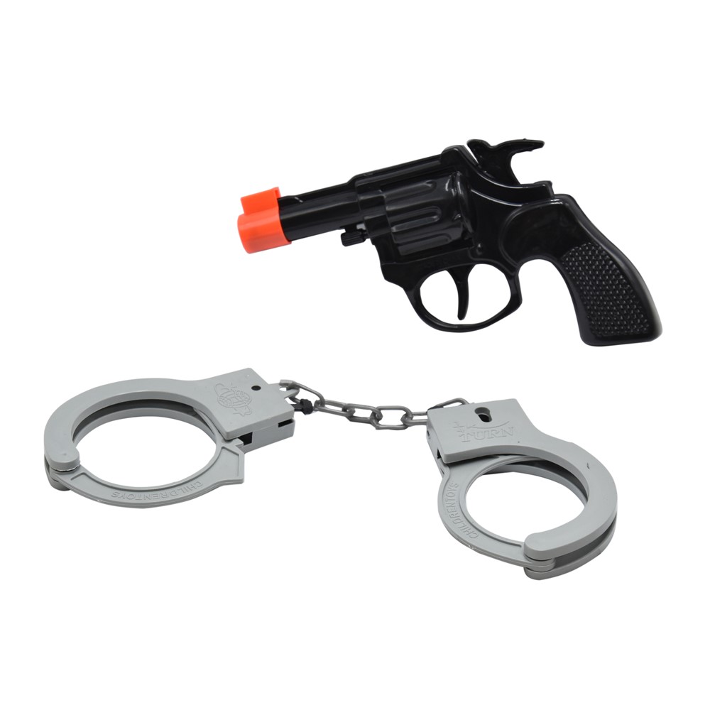 Set pistoletë me pranaga, prej materiali plastik në ngjyrë gri dhe të zezë. Seti përbëhet nga pranga në ngjyrë gri dhe pistoletë të zezë. Të përshtatshme për tematikën e halloweenit të policit, por përdoret edhe si lodër.