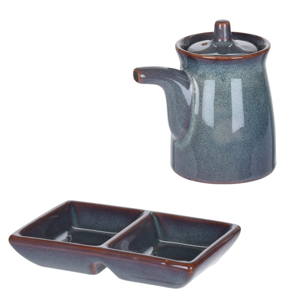 Tradita aziatike e servirjet të Sushit dhe ushqimeve tradicionale sjell këtë set prej 2 tasave dhe ibrikut përkatës