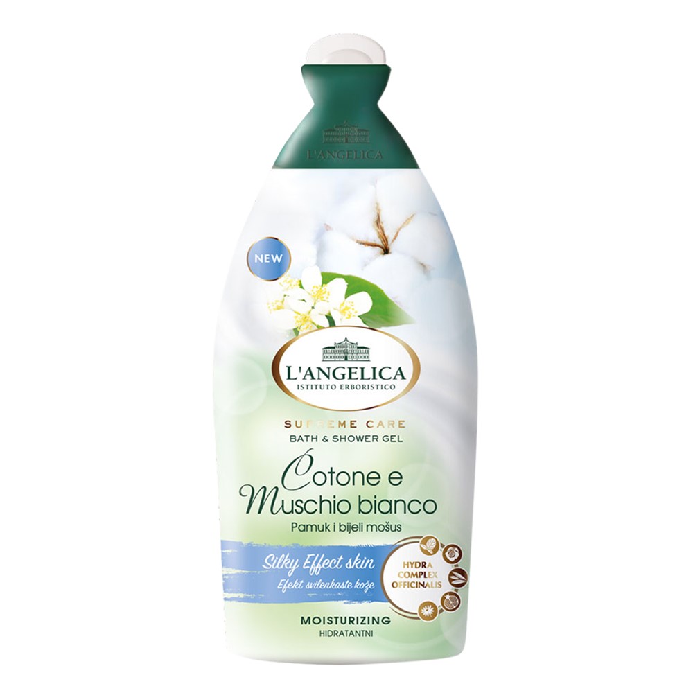 Shampo trupi Langelica, supreme cotton& muscio bianco, 500 ml. ormuluar me formule delikate, pa paraben, pa silikon. Kompleksi ushqyes me 5 përbërës të pasur me përbërës aktivë që rregullojnë hidratimin e lëkurës në kushte të ndryshme klimatike