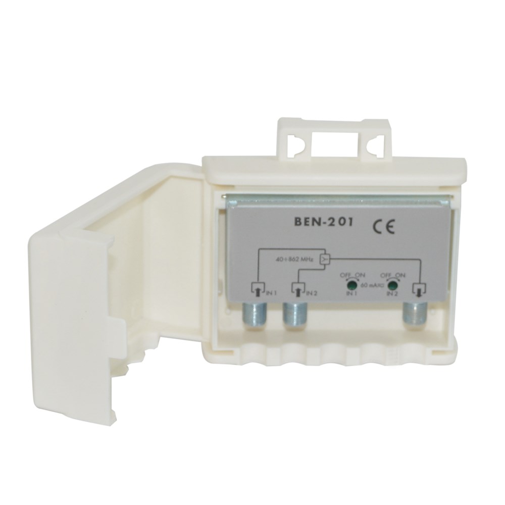 Shperndares sinjali TV BEN 201, 2-hyrje ne 1-dalje, VHF: 40-400 MHz, UHF: 470-862 MHz, 4.5dB humbje, 93 × 94 × 42 mm, IP53