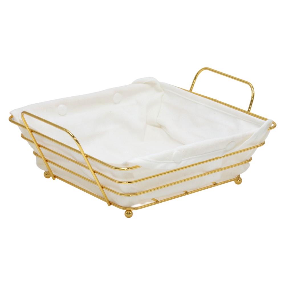 Shportë servirje metalike në ngjyrën floriri, me dimensionet 24x26xH10 cm. Ky produkt ofron një zgjedhje elegante për organizimin dhe prezantimin e produkteve të preferuara në tavolinë. E përshtatshme për bukë, panine dhe brumra të tjerë.