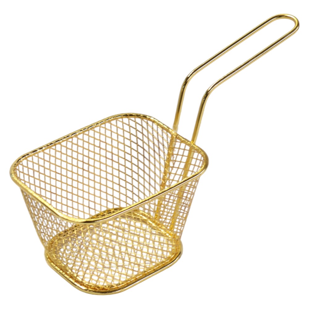 Shportë servirje metalike në ngjyrën floriri, me dimensionet 8x10xH5.5 cm. Ky produkt është i përshtatshëm për të shërbyer ose organizuar produkte në mënyrë të organizuar. E përshtatshme për kokteile të ndryshme, patate të skuqura, e të tjera.