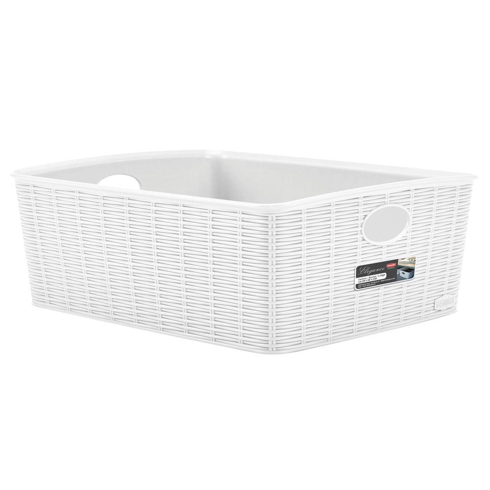 Shporta drejtkëndëshe nga linja Elegance, në ngjyrë të bardhë dhe në përmasën 36x29xH13 cm përshtatet si në tualet, në dhomë ose në kuzhinë. Shporta është një alternativë e shkëlqyer e shportave me thurje, që do të thotë ka një material plastik, që të jepë idenë e thurrjes por me një struktrë të thjeshtë dhe të lëmuar. Ky dizajn modern i kombinuar me vlerat e shërbimeve e bën shportën të përshtatet në mënyrë të përkryer në rregullimin e çdo hapësire të brendshme.