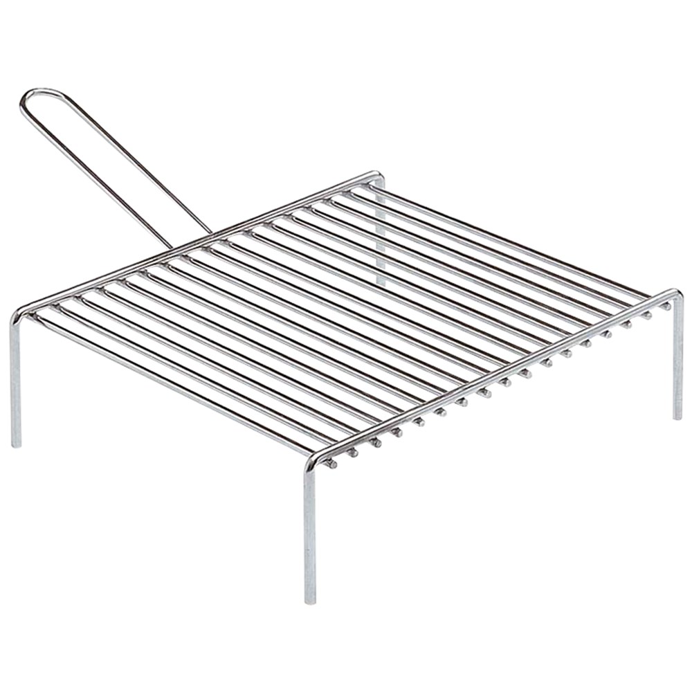 Grilë çeliku e kromuar me dorezë dhe me këmbë. Grila eshte e përshtatshme për tu përdorur ne furra zjarri Përmasa:30x30 cm.