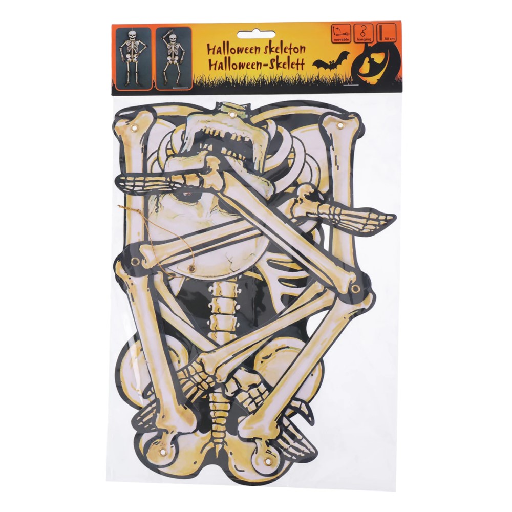 Skeletoni dekorues për Halloween, 80 cm, është një aksesor fantastik për të krijuar atmosferën perfekte të festës. I bërë nga plastikë rezistente, ai ka një dizajn të detajuar që i jep një pamje realiste. I lehtë për t’u vendosur, mund të përdoret në ambiente të brendshme dhe të jashtme për të frikësuar dhe argëtuar të ftuarit.