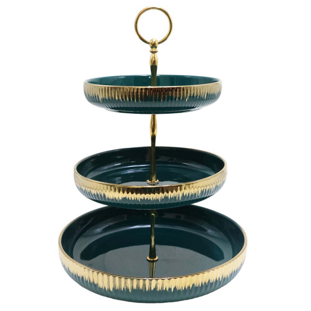 Stendë me tre kate, e realizuar nga qeramika në ngjyrën blu, me diametrin 30 cm. Ky produkt ofron një zgjedhje të stilizuar për të ekspozuar dhe servirur ushqime apo ëmbëlsira në një mënyrë të organizuar.