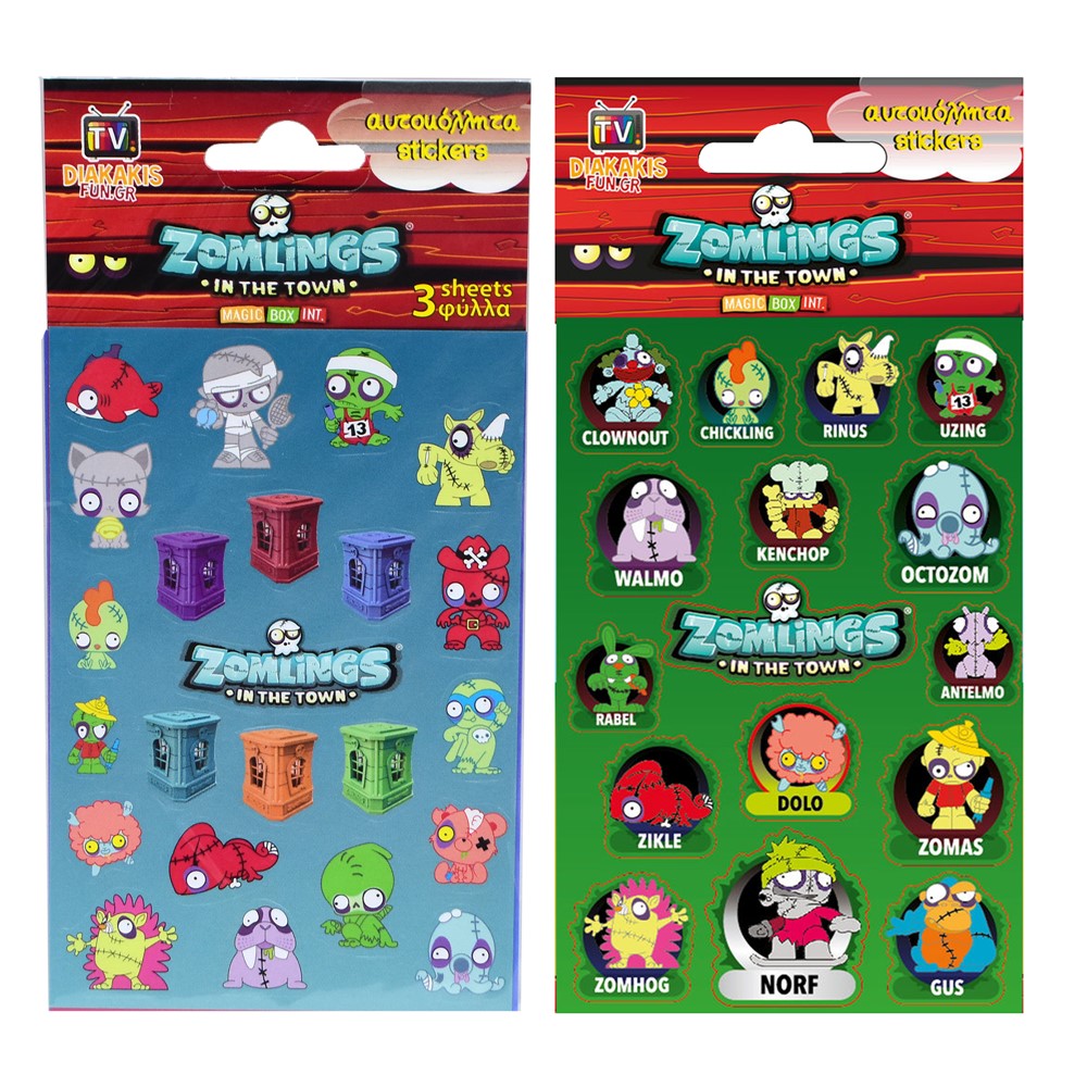 Stikera me figura për fëmijë, me dizajn Zomlings in the Town, prej materiali klorur polivinili (PVC), në ngjyra të ndryshme. Përdoren për të dekoruar librat, fletoret, letrat, kartolinat, kutitë e dhuratave, si dhe dhomat e gjumit të fëmijëve, dhe mund të vendosen në sipërfaqet e letrës dhe kartonit, mobiljeve të ndryshme, dyerve, etj.