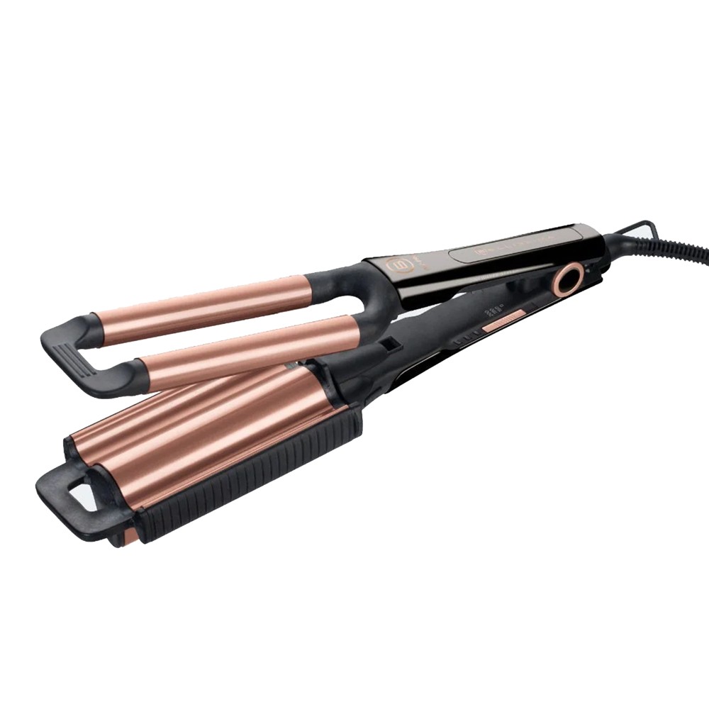 Drejtuesi i flokëve me valë Bellissima My Pro Beach Waves GT20 400 është gati t'ju mahnisë në versionin e tij të ri trëndafili të zi dhe ari My Pro. Flokët me onde vazhdojnë të jenë stili më i mirë për t'u ndjerë elegante dhe sensuale çdo ditë. E pajisur me një pllakë të dyfishtë me profil të kthyeshëm, me Bellissima Beach Waves Multi GT20 400 mjafton një klikim i thjeshtë për të rrotulluar anët e ndryshme të pllakës dhe për të krijuar valë të gjera ose të ngushta në varësi të pamjes suaj të preferuar. Veshja qeramike ofron shpërndarje homogjene të nxehtësisë dhe mbrojtje të lartë për flokët. Sistemi i kontrollit termik rregullon temperaturën (3 nivele nga 160°C në 200°C) duke ofruar rezultate optimale dhe duke kufizuar stresin në flokë.