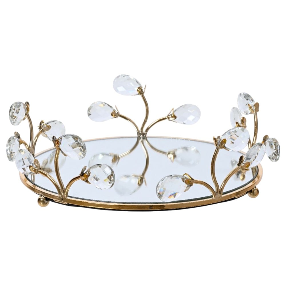 Kjo tabaka dekorative prej qelqi kombinon elegancën me një stil luksoz, falë detajeve me ngjyrë floriri dhe elementëve zbukurues në formë kristalesh. Me përmasa Dia.28.5xH10.5 cm, ajo shërben si një pikë qendrore në çdo ambient, qoftë mbi tavolinë, komodinë apo në një vitrinë dekorative. Struktura metalike në ngjyrë floriri i jep një pamje të sofistikuar, ndërsa detajet e punuara në formë degësh me kristale i shtojnë shkëlqim dhe finesë. E përshtatshme për vendosjen e aksesorëve, qirinjve, parfumave ose thjesht si element zbukurues.