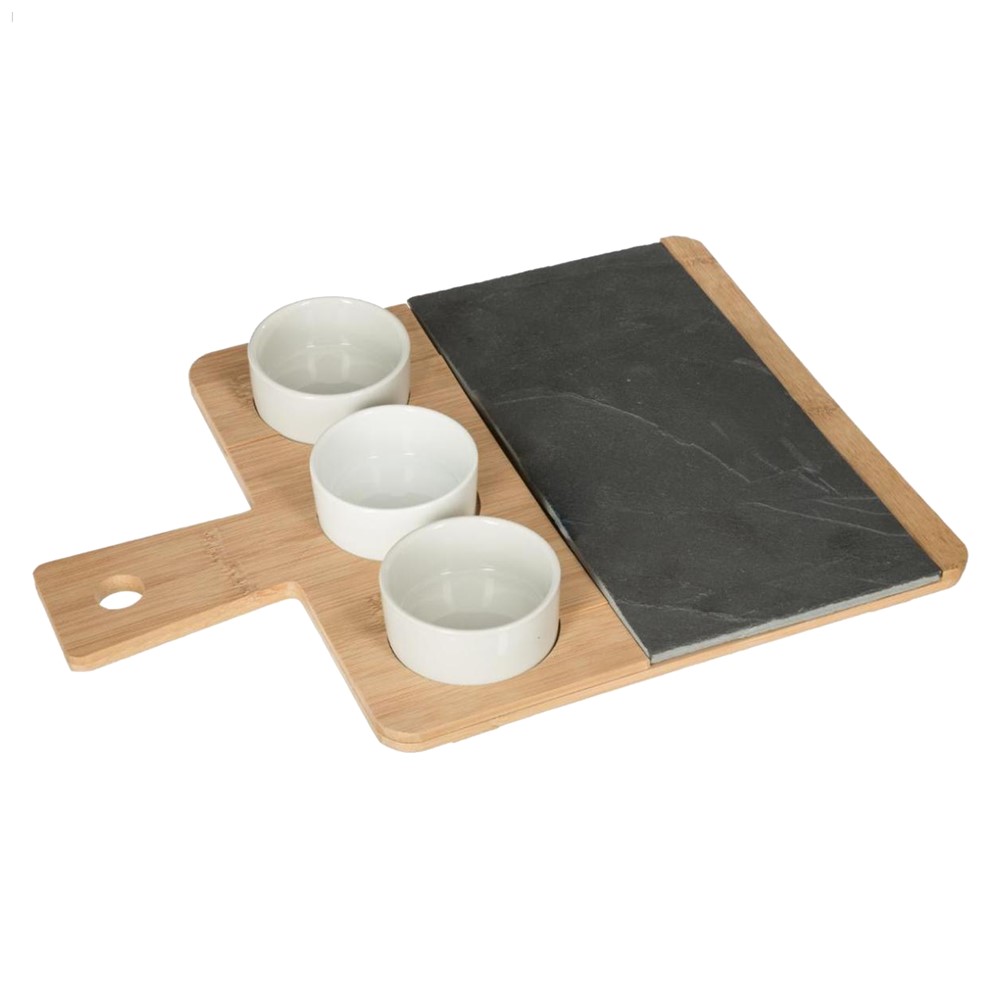 Tabaka për servirje është një element i domosdoshëm për pajisjet e kuzhinës dhe është i përshtatshëm për të shërbyer meze dhe ushqime të shpejta. Materiali i saj nga bambuja dhe guri janë të sigurta gjatë konsumimit të ushqimit. Në këtë tabaka mund të servirni mishra të ndryshëm, djathë, nachos, salca, ullinj ose ushqime të tjera.