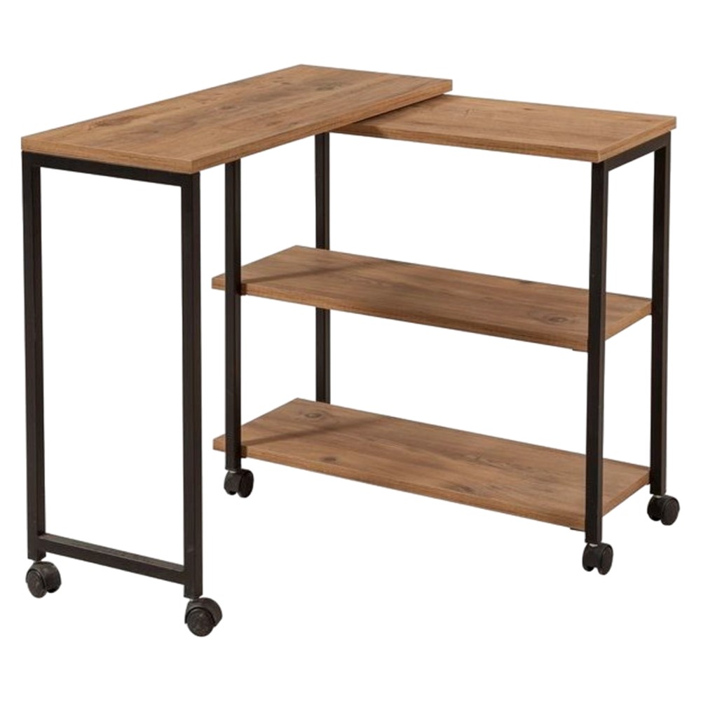 Tavolinë anësore, me strukturë mbajtëse metalike dhe syprinë melamine, në ngjyrë të zezë dhe kafe. Tavolina është e pajisur me 3 ndarje për vendosjen e revistave apo objekteve të ndryshme dekorative, si edhe ka një syprinë të sipërme e cila rrotullohet dhe hapet për të mundësuar vendosjen e laptopit apo librave, duke krijuar një hapësirë funksionale për të punuar apo studiuar. Struktura mbajtëse ka rrota me lëvizshmëri 360°, të cilat lejojnë zhvendosjen me lehtësi të tavolinës në hapësirën e dëshiruar. Dizajni minimalist e bën këtë tavolinë të përshtatshme për ambientet e dekoruara me stil kontemporan apo edhe tradicional.