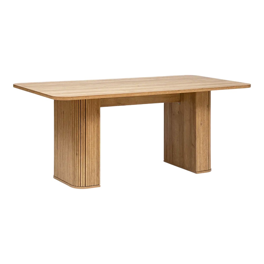Pavarësisht nëse jeni duke organizuar një darkë familjare apo një mbledhje miqësore, dhoma jonë e ngrënies është vendi ideal për të krijuar momente të paharrueshme. Me një dizajn modern që kombinon funksionalitetin dhe stilin, garanton që çdo vakt do të jetë një përvojë unike. E krijuar me një majë të rrumbullakosur të lëmuar dhe një efekt të fortë druri natyral, ai përmban një dizajn të mrekullueshëm të paneluar me vija të holla e të drejta përgjatë këmbëve.