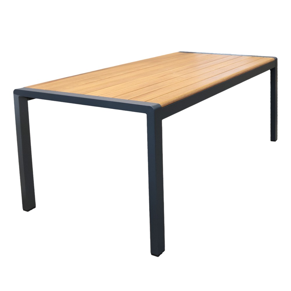 Arredoni në mënyrë elegante ambientin tuaj të jashtëm me modelet e reja të tavolinave me strukturë 100% alumini dhe druri Iroko të një cilësie mjaft të lartë. Struktura e saj prej alumini e bën këtë produkt të jetë shumë i fortë, rezistent dhe jetëgjatë por njëkohësisht mjaft të lehtë në peshë dhe me dizenjo që do i japi ambientit apo barit tuaj një pamje të bukur e plot hijëshi. E përshtatshme për përdorim familjar apo për bare e restorante. Përmasa me gjatësi prej 240 cm dhe gjerësi 100 cm, e bëjnë të përshtatshme për pritjen deri në 8 persona.