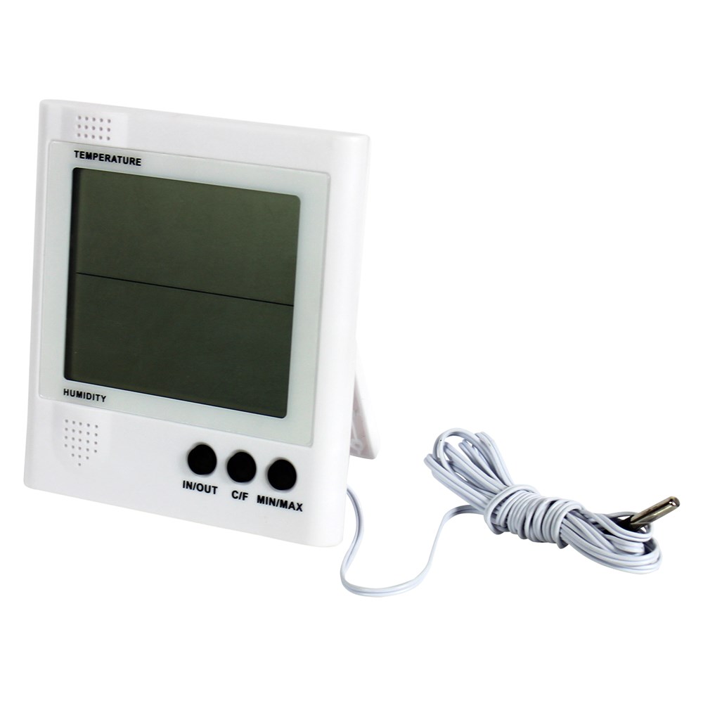 Termometër për ambiente të brendshme dhe të jashtme. Me një diapazon temperature -50°C deri 70°C për ambiente të jashtme, -10°C deri 50°C për ambiente të brendshme. I pajisur me një sensor temperature për ambiente të jashtme. Rezistent ndaj lagështirës.