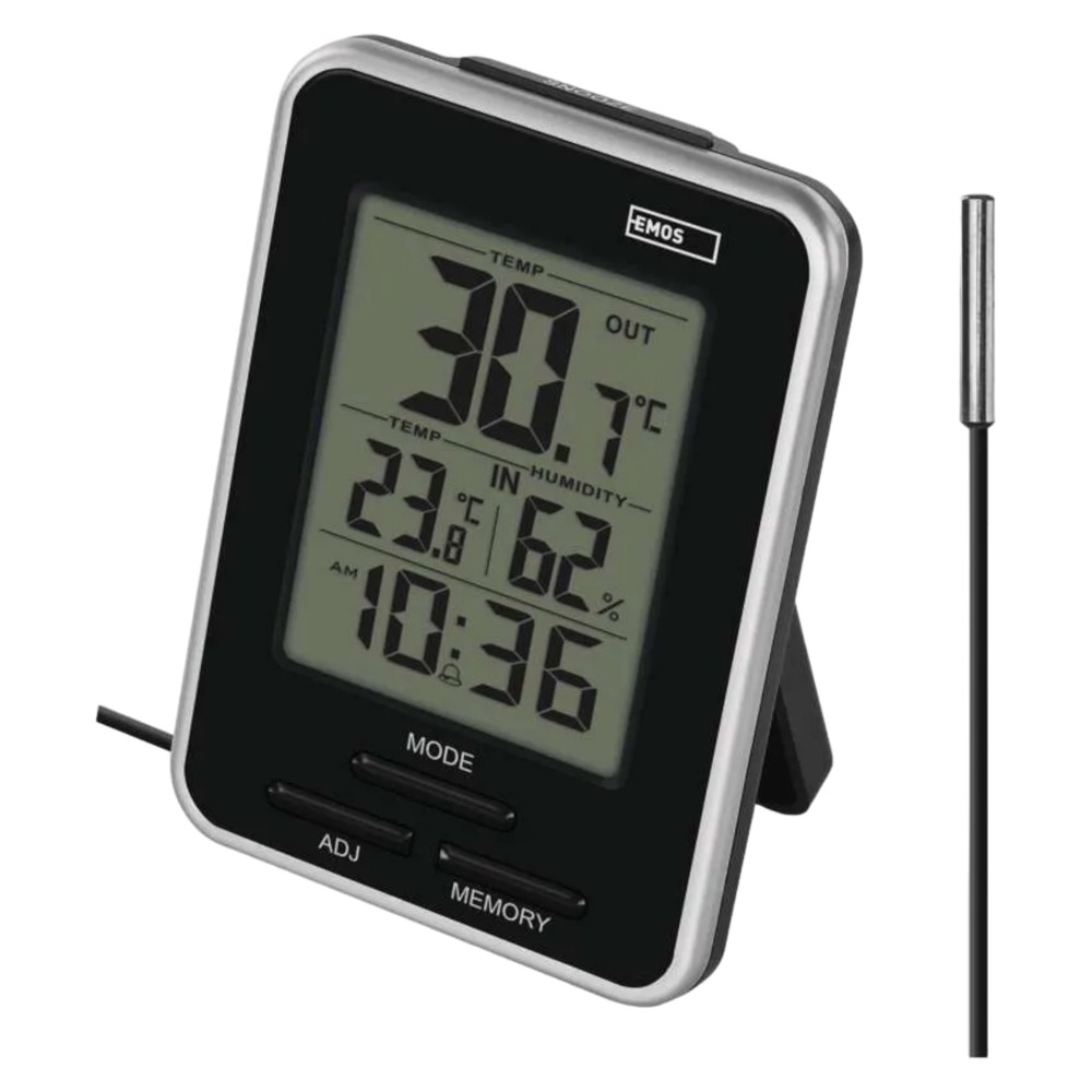 Cila është temperatura aktuale brenda apo jashtë? Të dyja këtyre pyetjeve do t'u përgjigjeni shumë shpejt me vetëm një vështrim në termometrin dixhital E0121. Do t'ju kënaqë jo vetëm me matjen e saktë të temperaturës së brendshme dhe të jashtme me një rezolucion prej 0,1 ° C, por edhe me matjen e përshtatshme të lagështisë së brendshme dhe shfaqjen e temperaturës minimale dhe maksimale. Termometri dixhital E0121 tregon temperaturën aktuale të dhomës në intervalin nga 0 °C deri +50 °C dhe temperaturën e jashtme në intervalin -40 °C deri +60 °C. Termometri mat gjithashtu lagështinë e brendshme që varion nga 25% në 95% RH. Një sensor me tela 3 metra i gjatë do t'ju ndihmojë të matni temperaturën e jashtme. Kështu që mund ta vendosni lehtësisht jashtë dritares dhe më pas ta mbështetni me lehtësi termometrin në dritare ose ta varni në mur. Çfarë tjetër ofron ky termometër? Këtu do të gjeni, për shembull, një orë ose një orë alarmi që ndizet shumë lehtë. Dizajni elegant me një ekran të madh e të qartë do t'ju tërheqë në shikim të parë. Termometri dixhital përshtatet në çdo hapësirë dhe nuk duhet të shqetësoheni se mos shpërqendrohet në asnjë mënyrë. Ne te kunderten! Puna e saktë dhe një ekran me shifra të mëdha të lexueshme të përkryer e çojnë këtë model në një nivel më të lartë dhe e bëjnë atë jo vetëm një ndihmës praktik, por edhe një aksesor interesant.