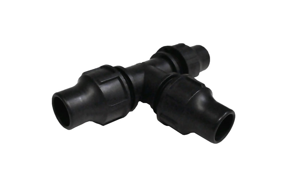 Ti me rakord 16X16x16 mm, prej PE me kënd 90°. Përdoret gjërësisht sot në Europe për instalimet këndore të linjave ujësjellëse, vaditjet në bujqësi etj. Kjo ti bën te mundur degezimin e rrjetit në kënd 90°. Kjo ti bashkon tre tuba të rrjetit me anë të shtrengimit mekanik me rakord. E prodhuar me standarte Europiane, rezistent ndaj lëndëve gërryese dhe projektuar për t'i bërë ballë presionit deri në 6 Bar.
