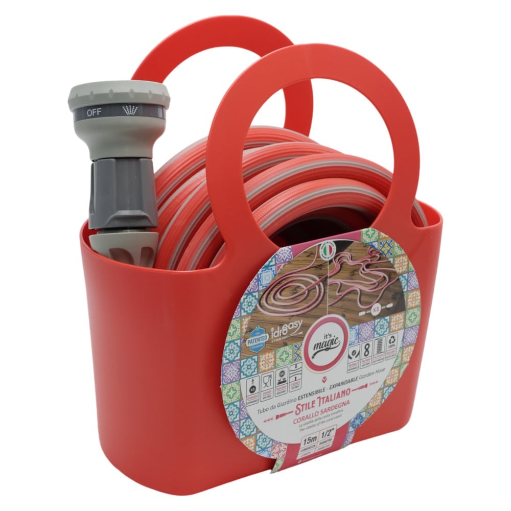 Ndërtuar nga plastikë elastike 100 % e riciklueshme me peshë të lehtë dhe rezistencë maksimale ndaj rrezatimit UV dhe degradimit që vjen si pasojë e kalimit të kohës. Seti prej 15 metra i tubit të zgjatueshëm me diametër 1/2" vjen edhe në një paketim me mbajtësen e tij duke përfshirë tubin 15 m, dy bashkues me klik dhe kokën e ujitjes. Materiali i tij e bën këtë produkt rezistent ndaj përdredhjes dhe garanton zgjatueshmëri deri në 3 herë më shumë sesa gjatësia e tubit fillestar.