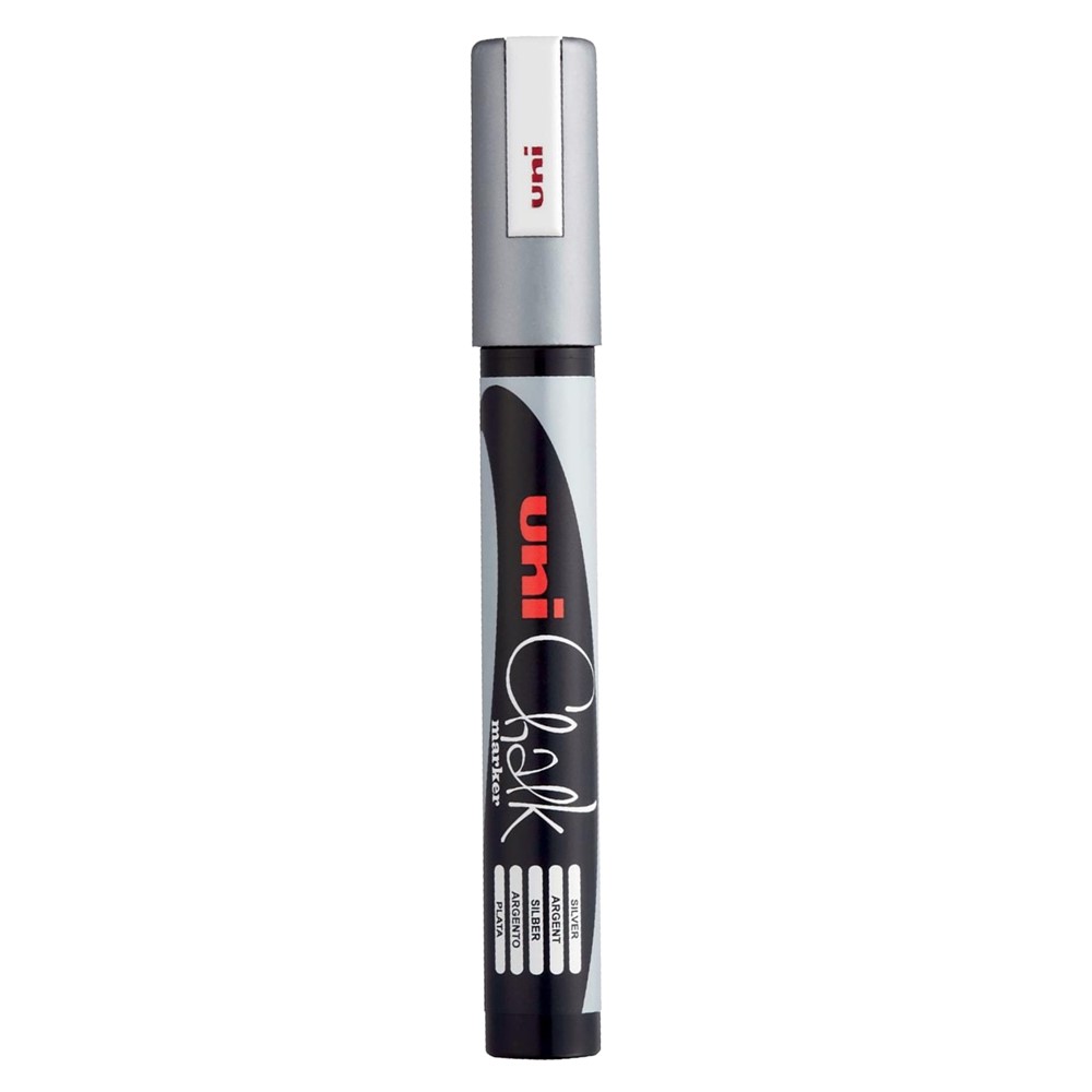 Shkumës me ngjyrë argjendi I lëngshëm Uni Marker. Shkruan në çdo sipërfaqe jo poroze (tabela e zezë, qelqi, plastika, metali, druri, etj.) Eshtë rezistent ndaj lagështirës dhe mund të pastrohet lehtë me një letër të lagur.