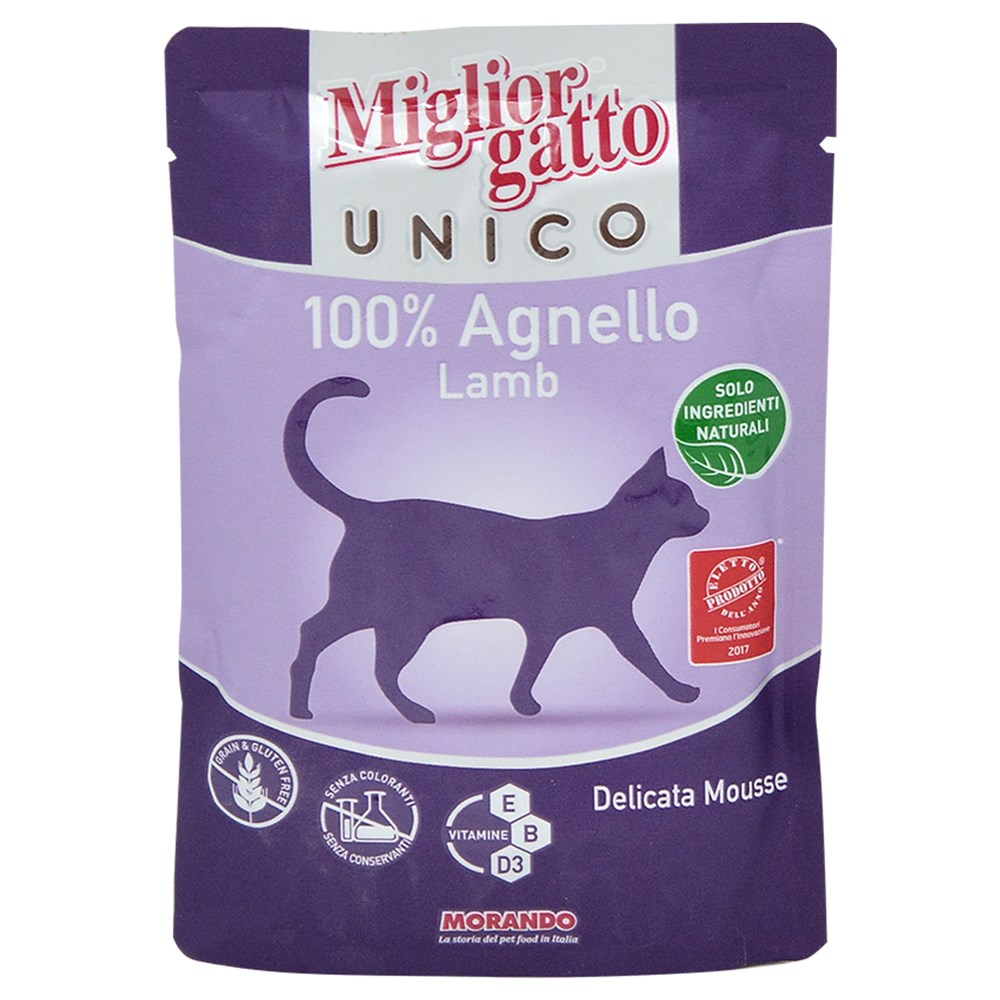 Migliorgatto Unico është një ushqim i plotë që është i përshtatshëm për ushqimin e përditshëm të të gjitha macet me përbërës natyralë. Karakteristikat e tij kryesore janë 100% e një burimi vetem me proteina. Përbërja: Mishi dhe derivatet e saj (100% Mish qengji), Substancat minerale. Vlerat ushqyese: Lagështia 82%, proteina e papërpunuar 12.5%, vajra dhe yndyrna të papërpunuara 2%, fibra bruto 0.3%, hiri i papërpunuar 1.5%. Aditivët ushqyes: Vitamina D3 172.4 IU / Kg, Vitamina E 16.7 mg / kg, Vitamina B1 3.8 mg / kg, Vitamina B 0.9 0.9 mg / kg, Monohidrat Zink Sulfat 11.4 mg / kg, Mangan Sulfat Monohidrat 4.4 mg / kg, Jodid Kaliumi 0.7 mg / kg.