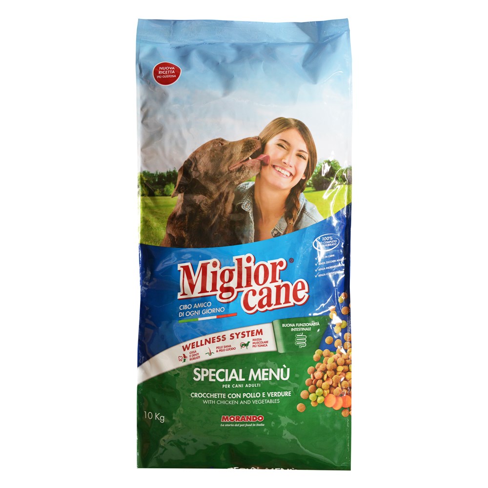 Ushqim për qen 10 kg. Migliorcane SPECIALE MENU me mish lope dhe perime. Drithëra (oriz 4%) - mishit dhe nenprodukteve të mishit (viçi 4%) - nënproduktet me origjinë bimore - perime 4% - vajra dhe acide, maja,minerale. Përbërësit analitike: lageshtira 10%, Vajra të papërpunuara dhe yndyrna 8%, Hi bruto 7.5%, proteinë e papërpunuar 19%, Fibër bruto 3.5%. Aditivëve ushqimore:vitamina A 11000 U.I./ kg , Vitamina D3 750 U.I / kg , Vitamina E 70 mg/kg, Oksid zinku 81 mg / kg, Sulfat bakri pentahydrate 20 mg / kg, Jodur kalium 2.3 mg / kg, Selenite sodiumi 0.2 mg / kg. Produkti është gati për t'u përdorur. Te ruhet në një vend të freskët dhe të thatë, larg nga rrezet e diellit.