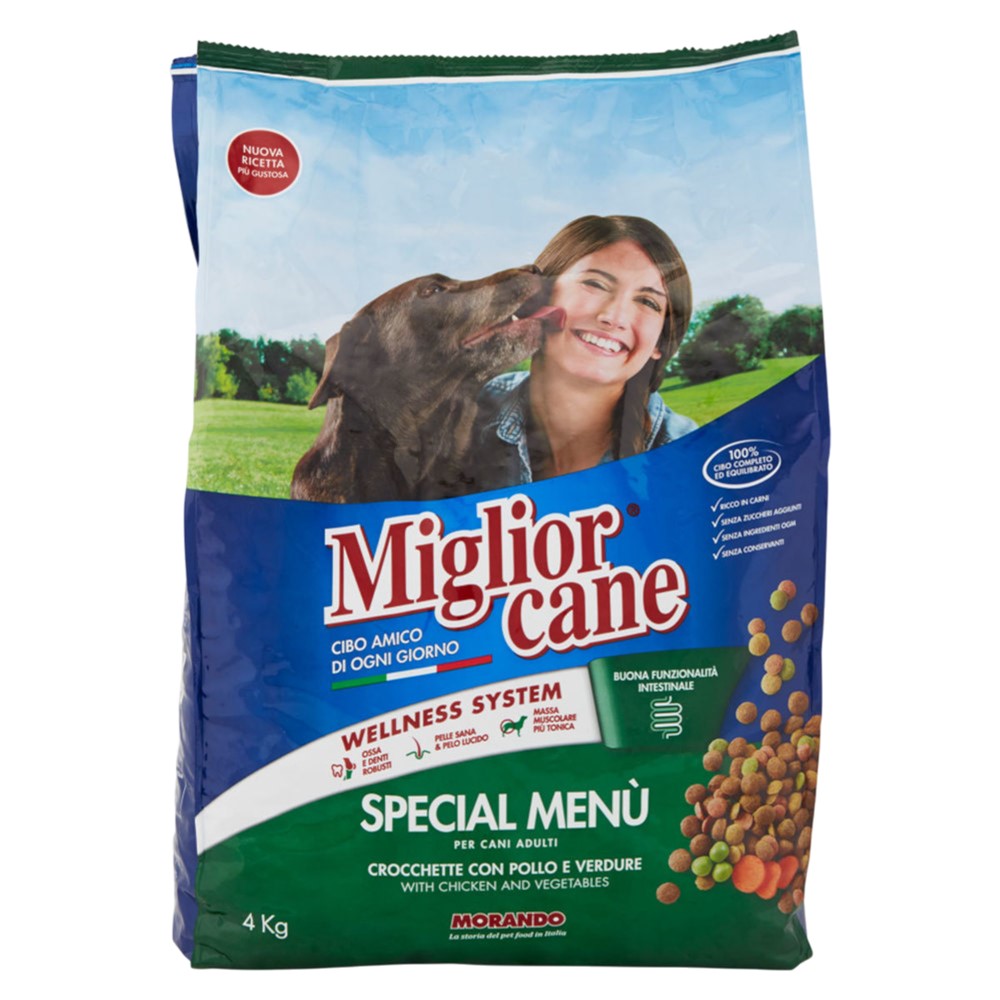 Ushqim për qen 4 kg. Migliorcane SPECIALE MENU me mish lope dhe perime. Drithëra (oriz 4%) - mishit dhe nenprodukteve të mishit (viçi 4%) - nënproduktet me origjinë bimore - perime 4% - vajra dhe acide, maja,minerale. Përbërësit analitike: lageshtira 10%, Vajra të papërpunuara dhe yndyrna 8.5%, Hi bruto 8.5%, proteinë e papërpunuar 21%, Fibër bruto 3%. Aditivëve ushqimore: itamina A 11000 U.I./ kg , Vitamina D3 750 U.I / kg , Vitamina E 70 mg/kg, Oksid zinku 50 mg / kg, Sulfat bakri pentahydrate 20 mg / kg, Jodur kalium 0.5 mg / kg, Selenite sodiumi 0.2 mg / kg. Produkti është gati për t'u përdorur. Te ruhet në një vend të freskët dhe të thatë, larg nga rrezet e diellit.