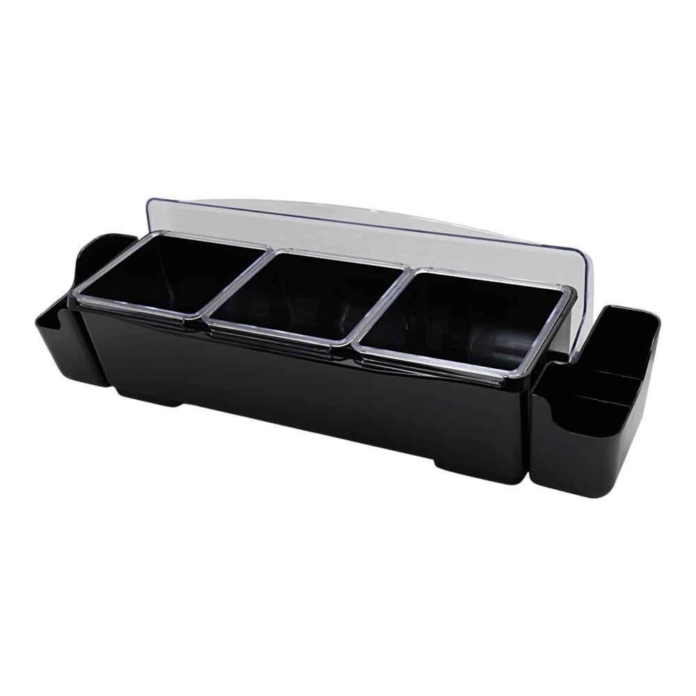 Kjo vasketë e zezë, e ndërtuar nga kombinimi i materialeve PC (polikarbonat) dhe ABS (akrilonitril butadien stiren), është një organizues i avancuar për shërbimin e barit ose tavolinës, që ofron 3 ndarje të veçanta dhe 2 mbajtëse shtesë. Dizajni i saj i integruar ndihmon në organizimin e aksesorëve të ndryshëm, duke siguruar një shërbim efikas dhe të pastër. Ideale për përdorim në bare, restorante, kafene dhe ambiente të tjera shërbimi ushqimi. Përdoret për të mbajtur aksesorët e nevojshëm për pije, ushqime, ose për të mbajtur salca.