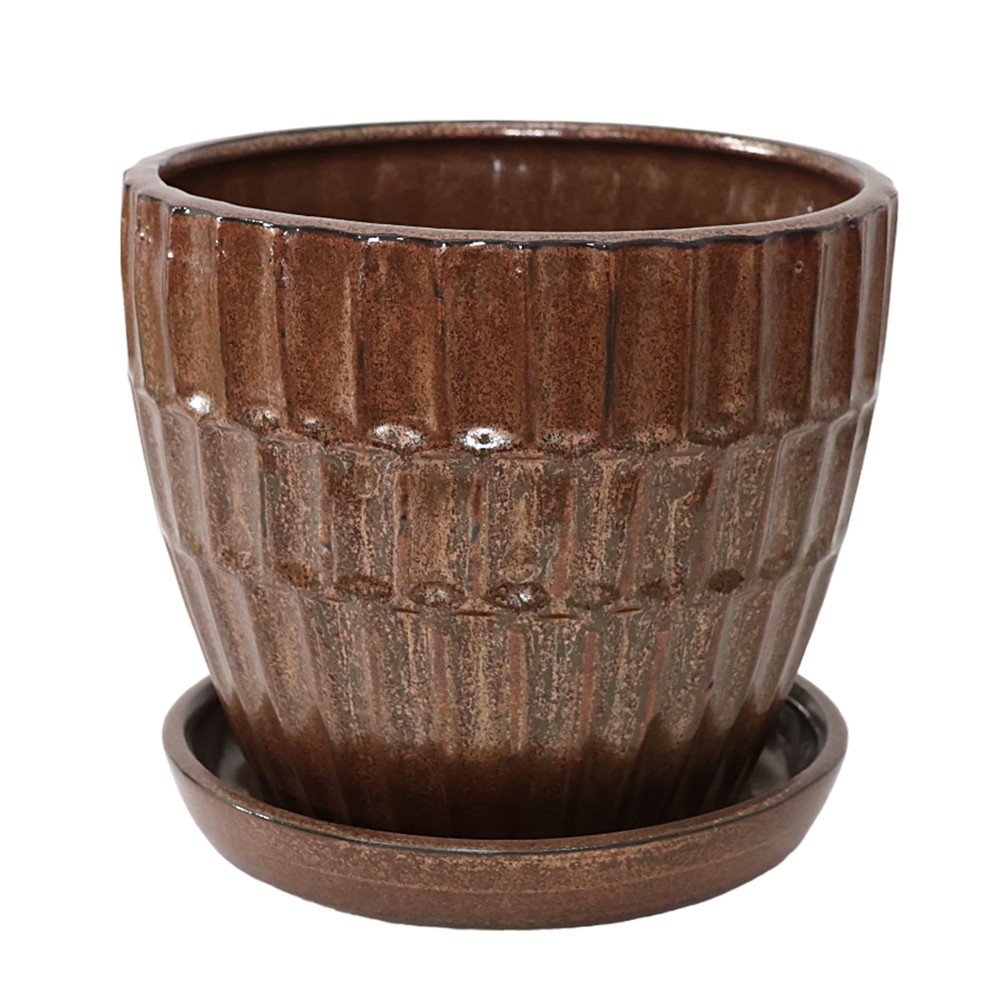 Kjo vazo lulesh është një element shumë i veçantë për të shtuar një prekje të ngrohtë dhe elegante në dekorin e shtëpisë suaj. Punuar me kujdes nga qeramika, ai vjen në një ngjyrë bakri, e cila jep një ndjesi të ngrohtë dhe të rafinuar në ambientin tuaj. Me dimensionet 19x19x17cm (gjerësi x lartësi x thellësi), kjo vazo është e përshtatshme për të vendosur lule të vogla ose dekorime të tjera në ambiente të ndryshme të shtëpisë suaj. Dizajni i thjeshtë dhe i pastër i vazos e bën atë të përshtatshme për të kombinuar lehtësisht me shije dhe stile të ndryshme dekorative në shtëpinë tuaj.