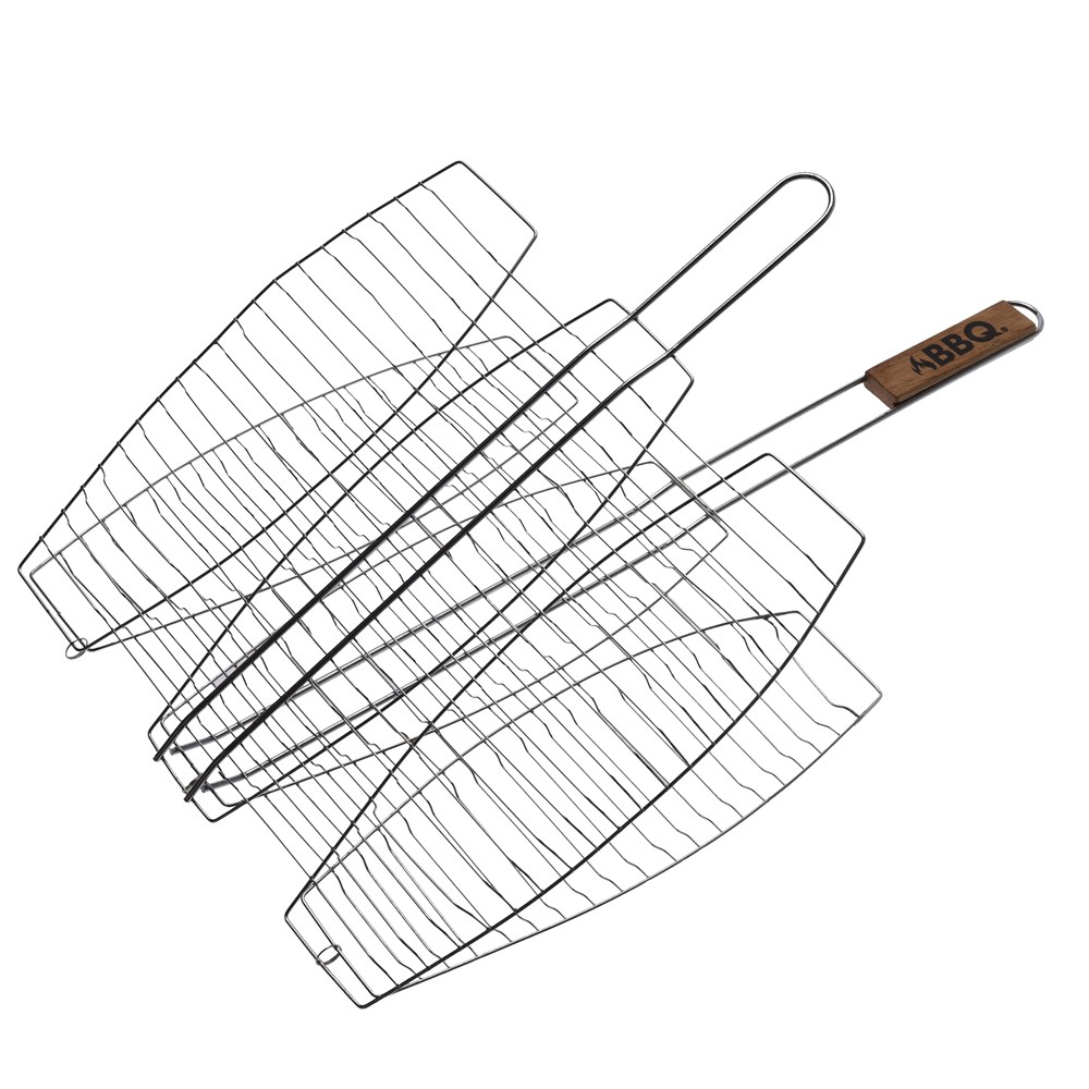 Skarë peshku për barbekju me 3 vende me përmasa 36 x 42 cm. Material inoksi, me dorezë druri. Ruan formën e peshkut dhe ndalon ngjitjen e tij në skarë.