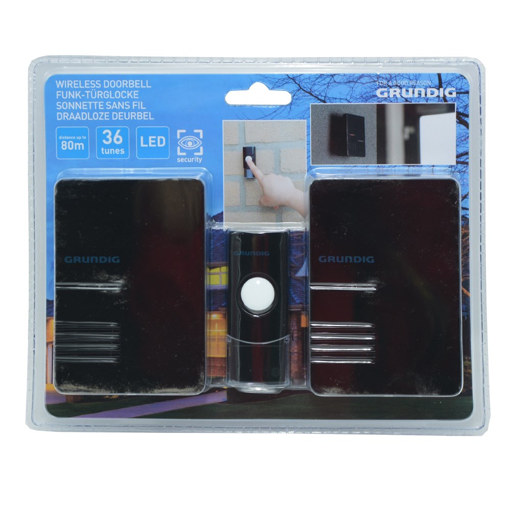 Zile zile elegante, pa tel, me një distancë deri në 80 m. Me transmetues me bateri dhe 2 marrës. Sinjalizimi bëhet në mënyrë akustike dhe / ose optike (drita e ndezjes së kuqe).